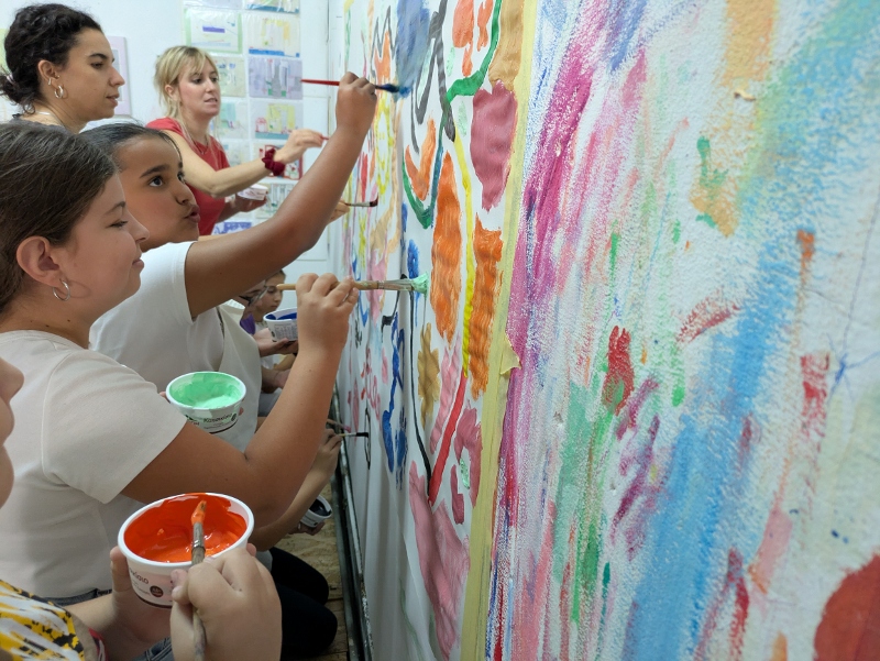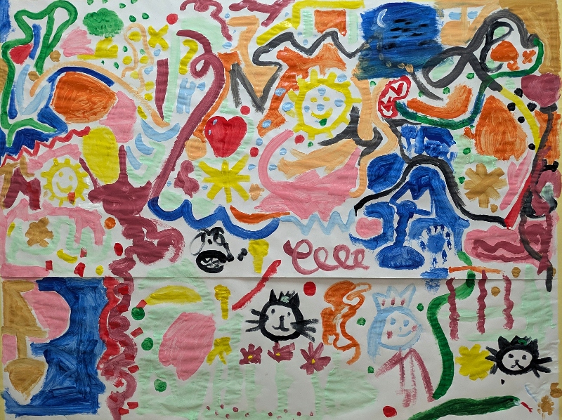 Στόχος της συνάντησης ήταν να γνωριστούν όλες και όλοι οι συμμετέχοντες μέσα από την συνδημιουργία ενός ομαδικού έργου. Μία ομαδικά ζωγραφισμένη γραμμή, ως πρώτο ίχνος στο μεγάλο χαρτί στον τοίχο, ήταν απλά το ξεκίνημα. Με ένα ζάρι που “καθοδηγούσε” σηκωνόταν μία μία, ένας ένας αλλά και συχνά όλη η ομάδα μαζί για να προσθέσει στο έργο. Πάνω στο χαρτί αποτυπώθηκαν τα συναισθήματα του κάθε παιδιού σε διαφορετικές στιγμές της διαδικασίας, συναισθήματα που εκφράστηκαν με χρώματα, σχήματα, γραμμές. Η αρχική αμηχανία έδωσε χώρο σε ανταλλαγή απόψεων και συν-δημιουργία. Και όπως είπε η Ελένη σε “θάρρος για ζωγραφική“.